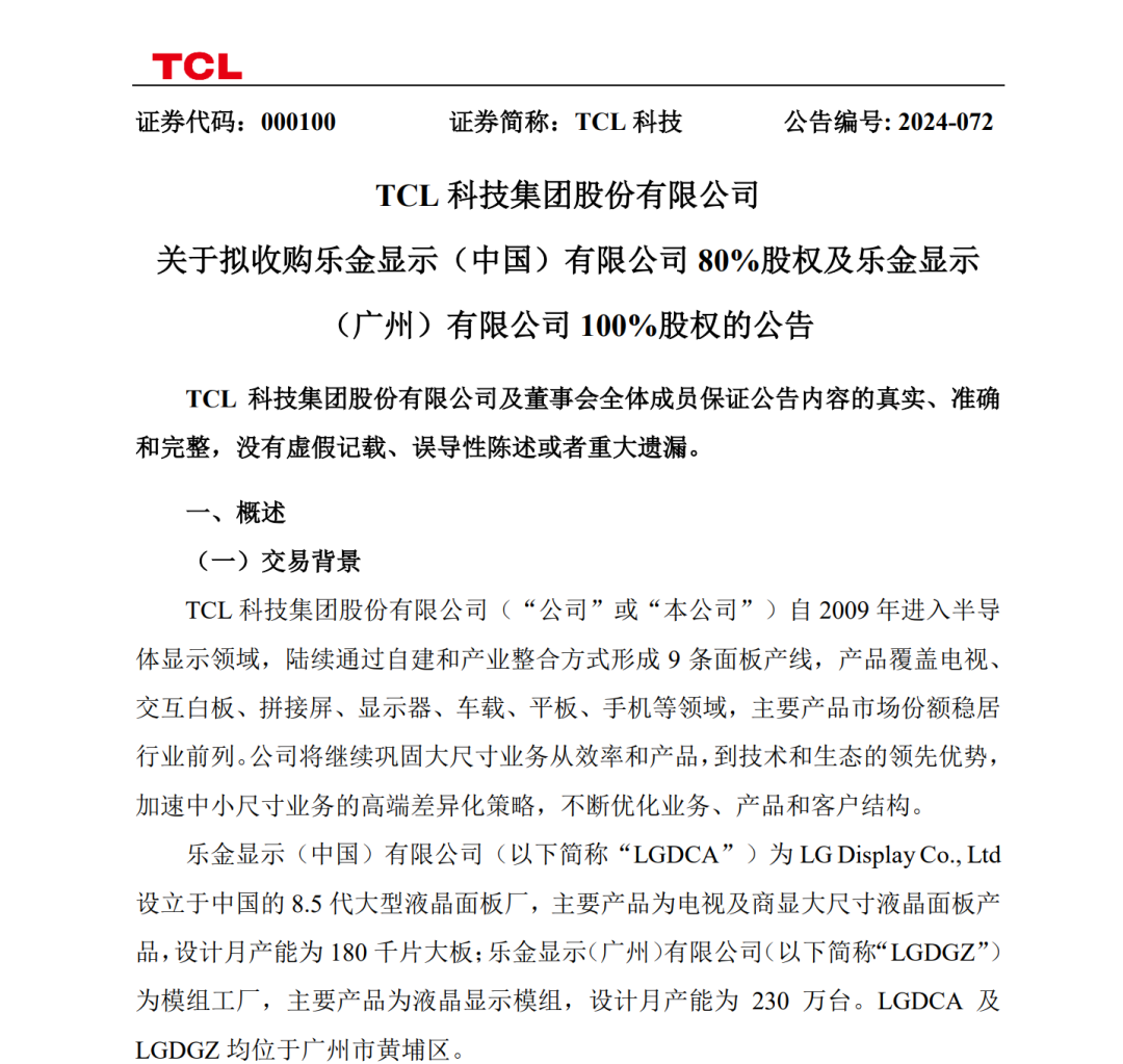 去年9月,TCL科技发布公告称斥资108亿元收购韩国厂商LG在广州的相关液晶面板业务资产。今年1月,再度通过公开摘牌受让,以26.15亿元的价格拿下后者20%的股权。