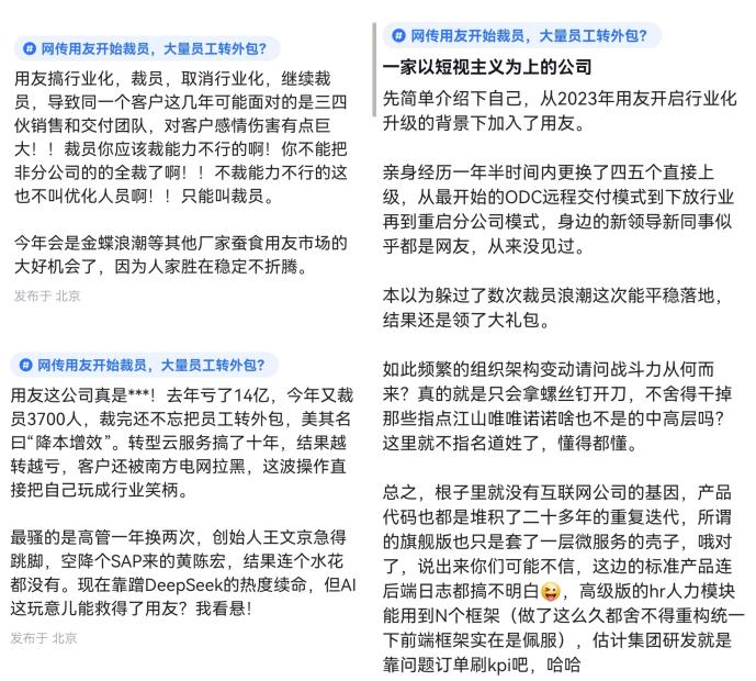 3月10日起,脉脉、小红书等社交平台上有大量传闻,称用友网络将大量撤裁研发、交付部门的员工,其中研发部门可能裁掉50%以上,而交付部门要将80%的人转向外包,总共影响人数可能达到2000人。