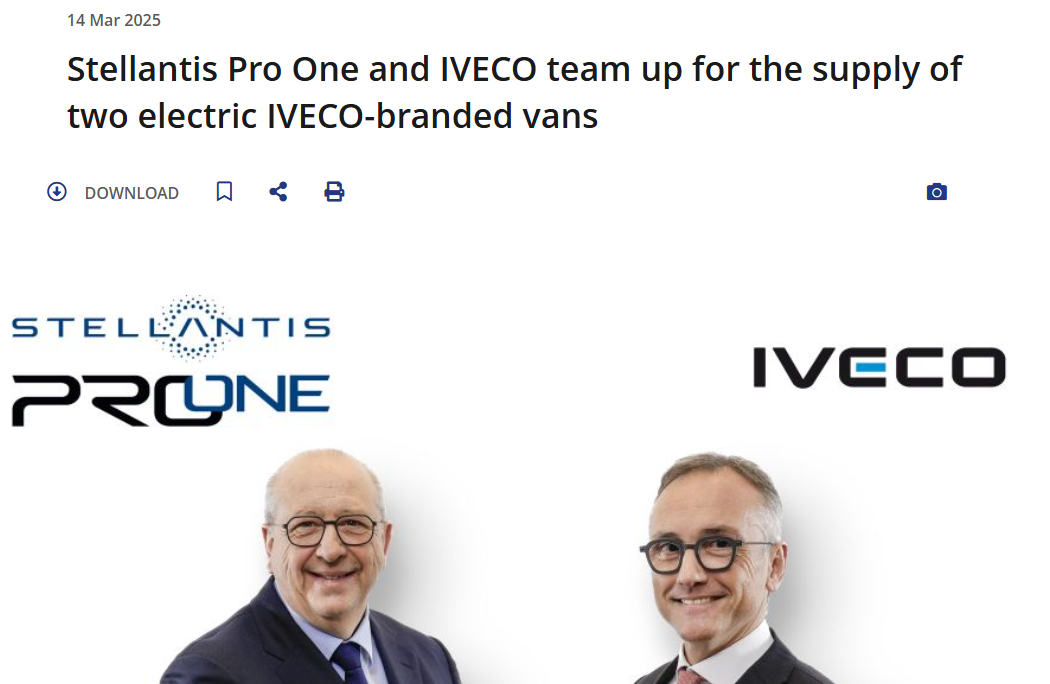3月14日,Stellantis旗下部门Stellantis Pro One宣布同依维柯达成合作,将在意大利阿泰萨、波兰格利维采和法国奥尔丹工厂生产依维柯的两款全电动厢式货车。交付后,依维柯将通过其现有销售及服务渠道在包括英国在内的欧洲市场销售这两款车型。