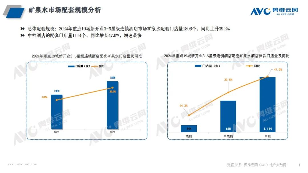 酒店总体市场:奥维云网(AVC)监测数据显示,2024年一线、新一线19城新开业3-5星级连锁酒店1910家,同比+39.2%,规模20.22万间,同比+32.0%。矿泉水作为酒店高配产品,配套门店量1901家,配置率99.5%,个别酒店配套饮料用品。