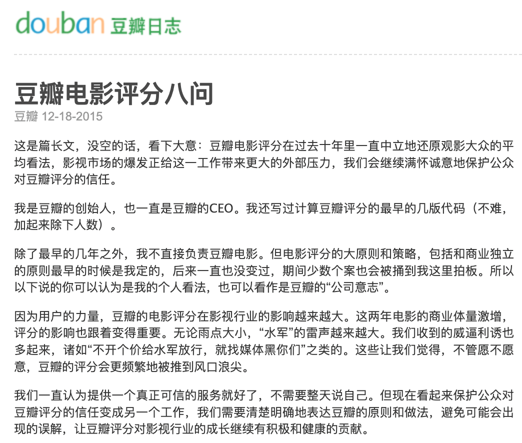 尽管如此,在这个网络舆论日趋分裂、极化,影视“胫骨”四处出击的时代,我们仍然需要豆瓣这样一个汇聚各种声音、容纳好评差评的舆论空间。或许,只有等到失去之后,我们才会意识到豆瓣评分对于影视行业生态究竟有多重要。