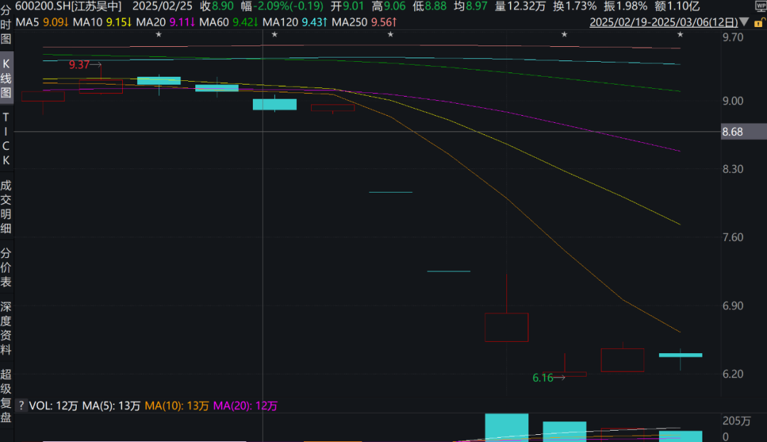 3月10日,江苏吴中上涨1.77%,次日下跌3.32%。截至3月12日,江苏吴中报收6.05元/股,总市值43亿元,股价仍处于低位。