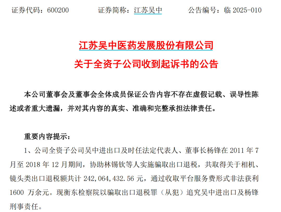 江苏吴中公告称,子公司江苏吴中进出口有限公司(下称:吴中进出口)及时任法定代表人、董事长杨锋,涉嫌在7年内实施骗取出口退税共计2.42亿元,非法获利1600万余元。