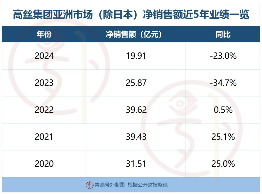 从更长的时间线来看,高丝集团近两年在亚洲市场的表现明显失速。青眼号外梳理发现,2020年和2021年,高丝集团在亚洲市场的净销售额均实现了双位数的快速增长。然而,从2022年开始,增速显著放缓;到2024年,该集团在亚洲市场已连续两年出现下滑。