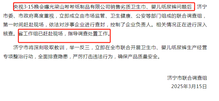 事件曝光后,济宁市立即成立由市场监管、卫生健康、公安等部门组成的联合调查组,第一时间赶赴现场,依法对涉事企业进行查封,控制了企业负责人。相关情况正在进行深入核查。同时,山东省工作组已赶赴现场,指导调查处置工作。