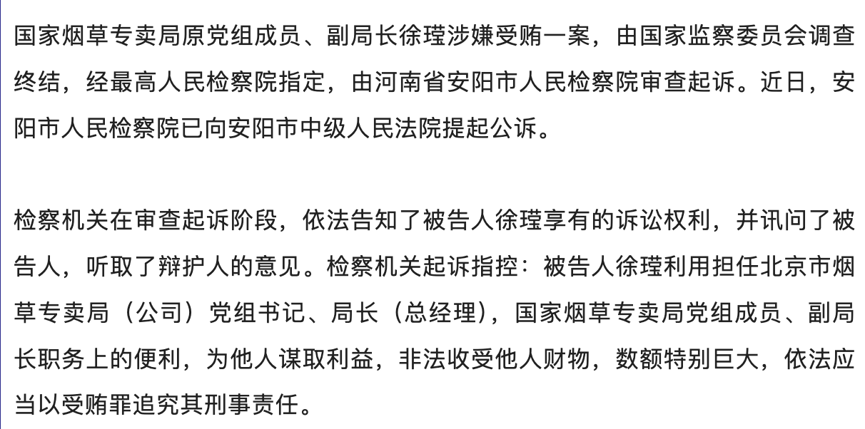 涉嫌受贿,国家烟草专卖局原副局长被提起公诉