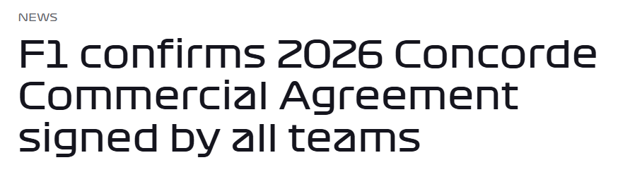 世界一级方程式锦标赛(F1)3月16日宣布,确认所有车队已签署《协和协议》,该协议“确保了这项运动的长期经济实力”。