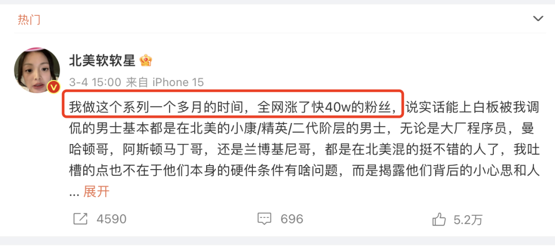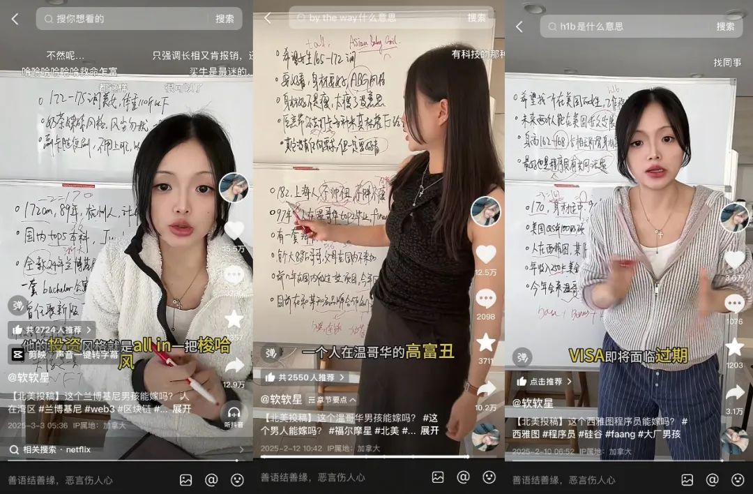 近期,相亲分析赛道又冲出来一位快速涨粉的达人——@软软星,这次是更聚焦、更垂直的北美留子赛道,分析的案例也都是“有无绿卡”、“全款买house还是贷款apartment”、“先买跑车还是先买SUV”......诸如此类的高端局,毫无疑问,最后依旧会拆解出“刚离婚”、“只是想找一个免费助理”、“被家里流放的庶子”等与光鲜的简历有强反差感的人设结论。