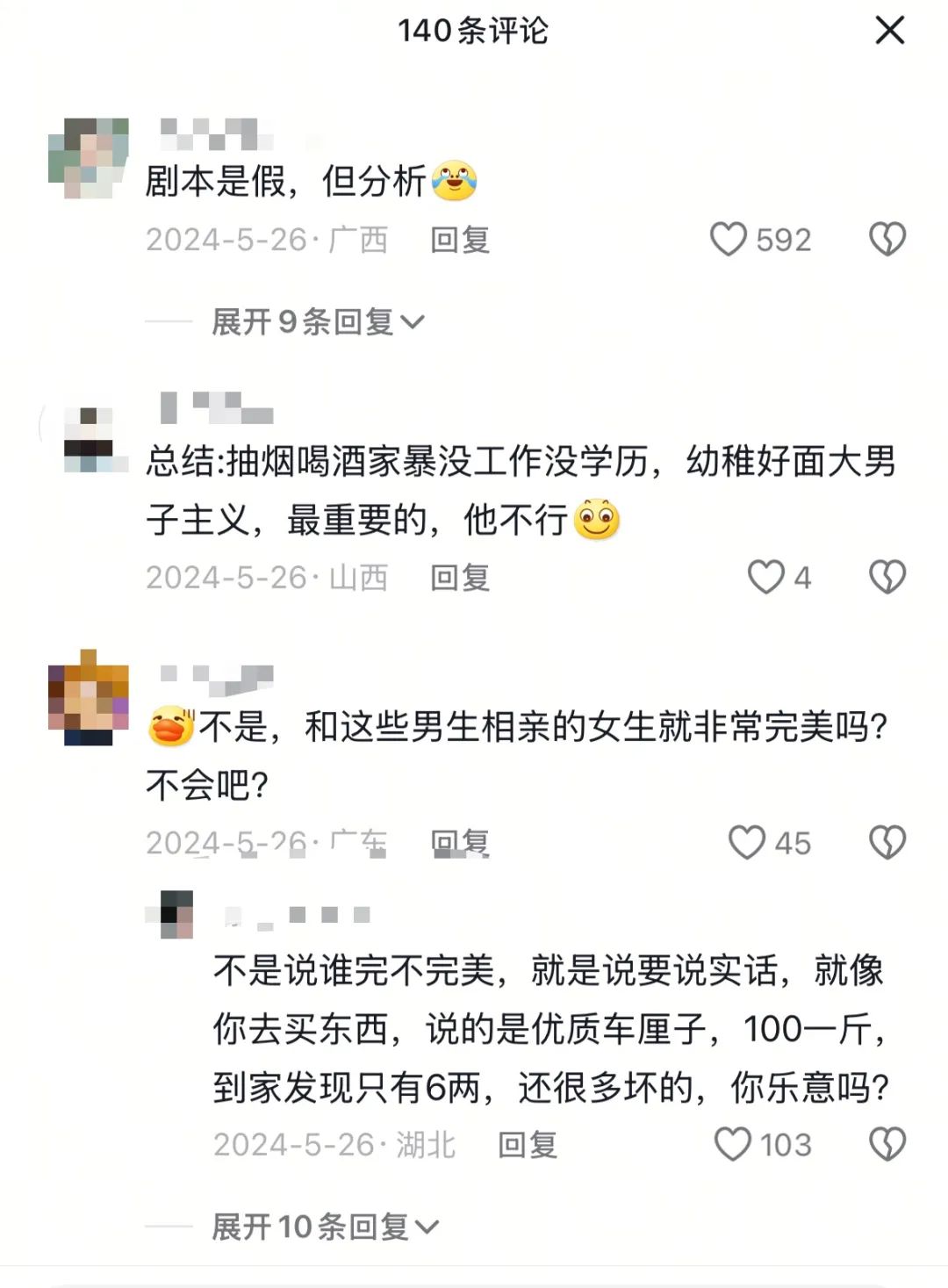 “剧本是假,但分析有一定的道理”,很多网友本身是抱着这种心态才看相亲分析视频,而这是长期藏在相亲市场中,但并没有被揭示出来另一面。毕竟大多数牵线人只会通过扬长避短、劝告双方放低要求来促进成单率,最终导致相亲市场的履历膨胀,真假参半。