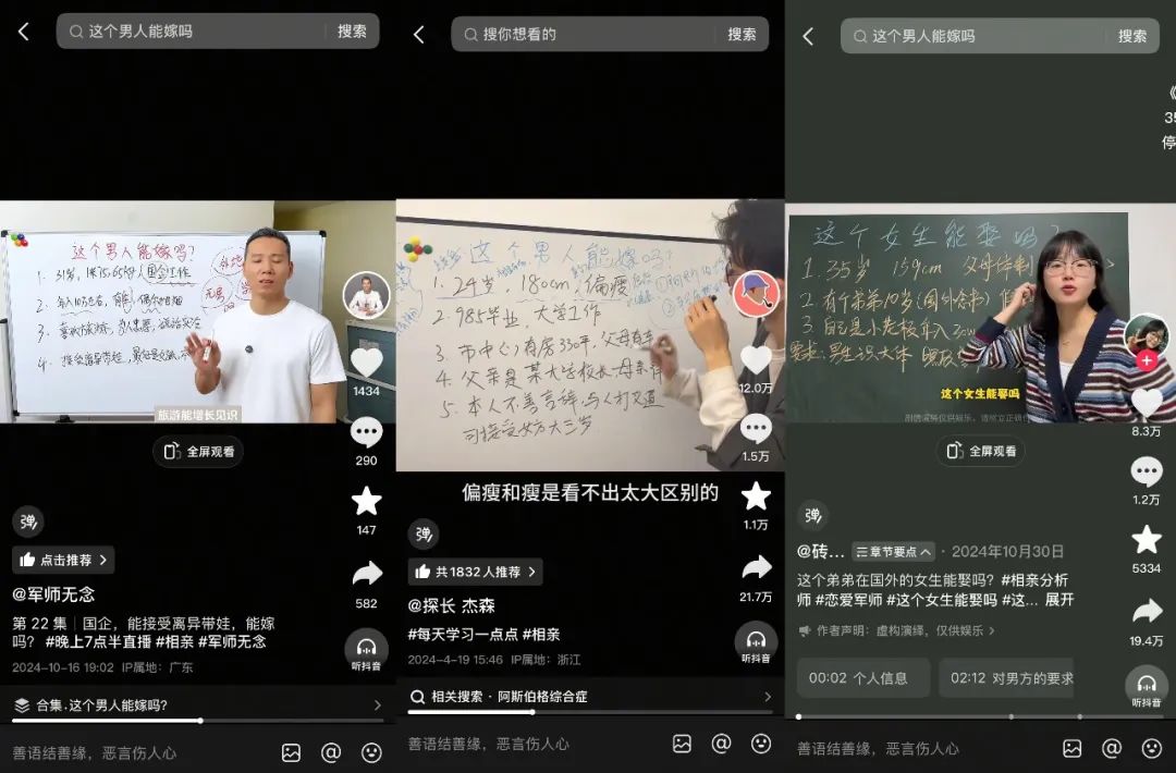 其实在此之前,就已经有一批相亲分析师成功出圈,包括去年3天涨粉40万的代表性博主@军师无念,靠30多个作品涨粉近60万的@探长 杰森,巨大的流量热度下,也有不少情感博主陆续涌入了相亲分析的赛道,还衍生出了“这个女生能娶吗?”系列视频。