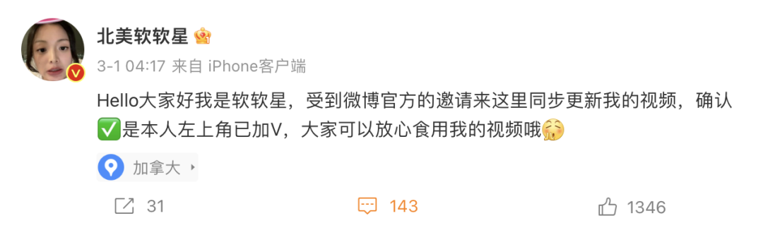 目前@软软星 除了抖音外,也入驻了B站、微博、小红书等平台,且微博是“受到官方的邀请来这里同步更新”。