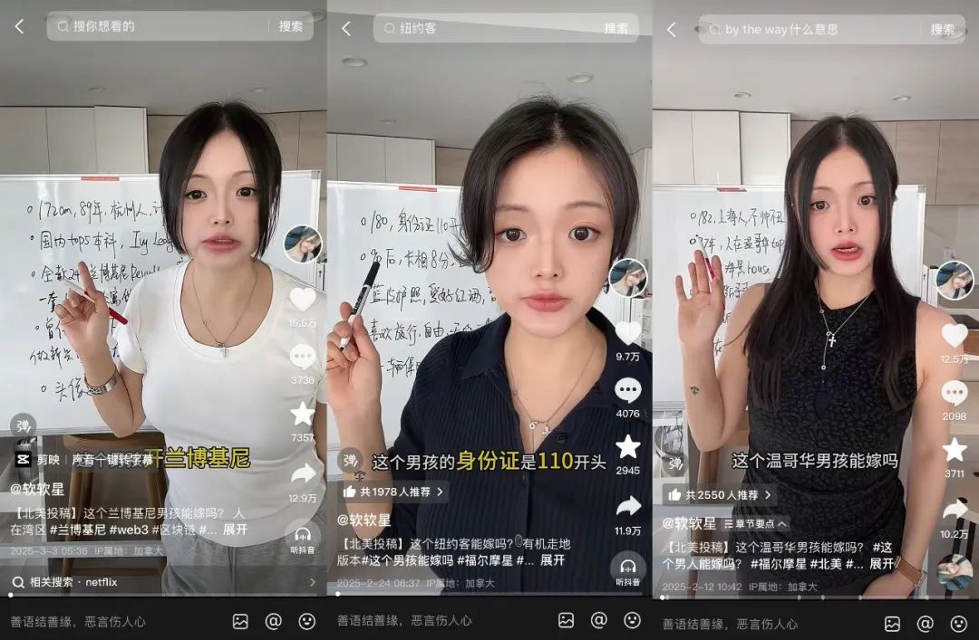 相比其他相亲分析博主,@软软星 的内容其实揭开了精英阶层的相亲面具,透过漂亮的履历看到一些精心藏起来的小心思,在这一赛道打开了差异性、满足了很多人的窥探欲。但这本身也与博主本人的履历有关,据了解@软软星 也是留子一员,且是加拿大永久居民,目前已在加拿大生活10年。