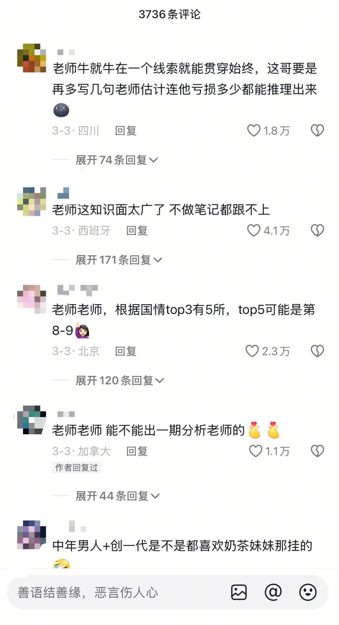 一顿分析推理下来,不由让人感慨,“老师知识面太广了,不做笔记都跟不上”、“这哥要是多写几句,老师估计连他亏损多少都能推理出来”。