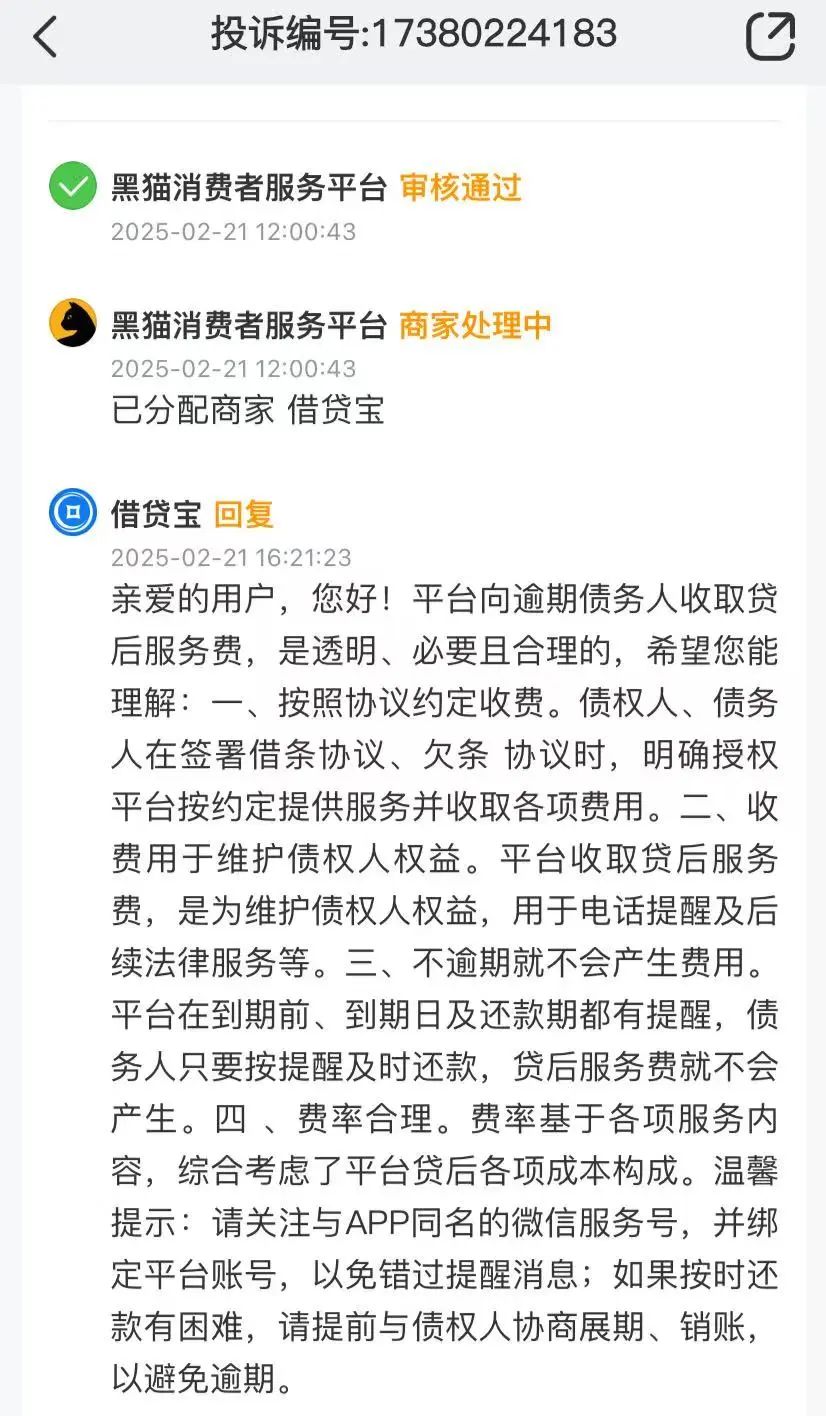 而借款人投诉收费不合理的问题后,借贷宝客服回应称,平台向逾期债务人收取贷后服务费是透明必要且合理,债权人、债务人签署借条协议时,明确授权平台按约定提供服务并收取各项费用,而平台收取贷后服务费,是为了维护债权人权益,用于电话提醒及后 法律服务等,如果不逾期就不会产生费用,费率是基于各项服务内容,综合考虑了平台贷后各项成本构成。