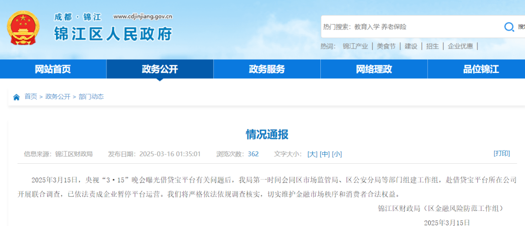 被央视曝光电子签里的隐身放贷人问题后,成都市锦江区人民政府网站连夜发布了一则情况通报指出,锦江区财政局(区金融风险防范工作组)第一时间会同区市场监管局、区公安分局等部门组建工作组,赴借贷宝平台所在公司开展联合调查,已依法责成企业暂停平台运营,并表示严格依法依规调查核实,切实维护金融市场秩序和消费者合法权益。