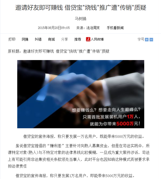 借贷宝起初以P2P业务为主,2015年8月,公司曾以“拉上好友抢红包,轻轻松松玩出钱”为活动口号,号称出资20亿元进行产品推广。虽然具体投入的资金数额无法考证,但这次推广确实在互联网金融圈造成了很大的轰动。