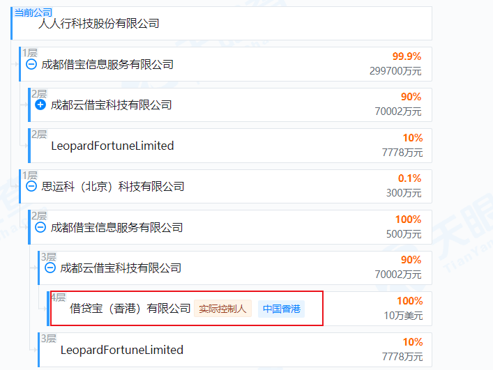 天眼查APP显示,借贷宝为人人行科技股份有限公司(下称“人人行”)旗下品牌,人人行成立于2014年12月22日,法定代表人为王璐,注册资本为30亿元,经营范围投资投资咨询、企业管理咨询、经济贸易咨询等。借贷宝由成都借宝信息服务有限公司、思运科技有限公司共同持股。股权穿透后,借贷宝控股股东为借贷宝(香港)有限公司。