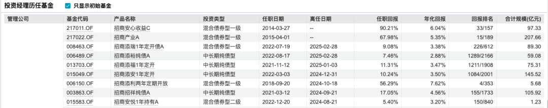 此外,2024年8月21日,马龙卸任了招商安悦1年持有A管理职务,任职回报5.4%,年化回报3.2%,该产品目前规模1.23亿元;同年10月18日,卸任招商添利两年定期开放,任职回报56.29%,年化回报7.62%,该产品目前规模5.68亿元;2025年1月3日卸任招商添福1年定开,任职回报11.31%,年化回报3.47%,该产品目前规模75.31亿元。