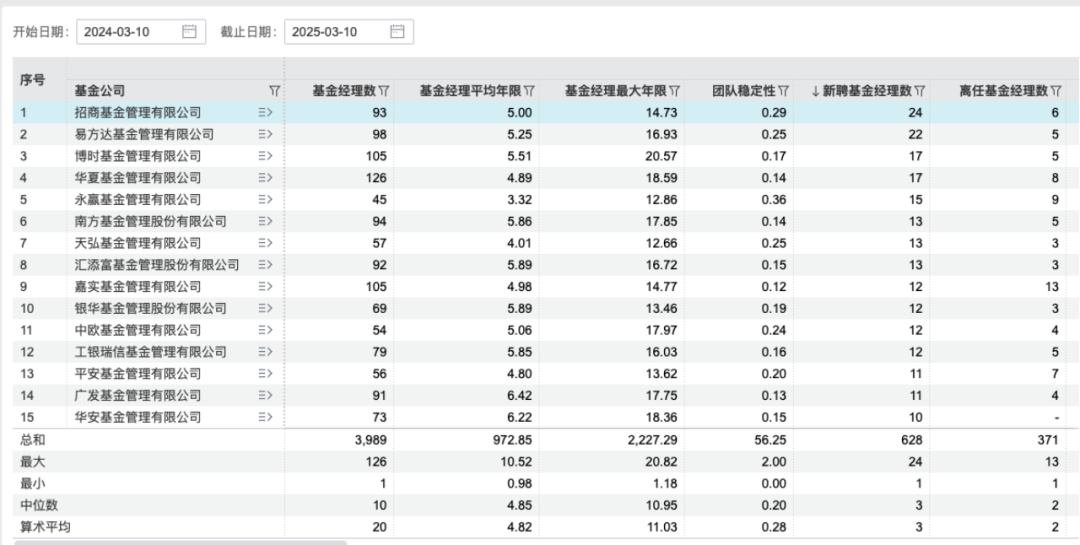 此外,目前招商基金共有93位基金经理,近一年新聘了24位,排行第一,行业平均数为3位。