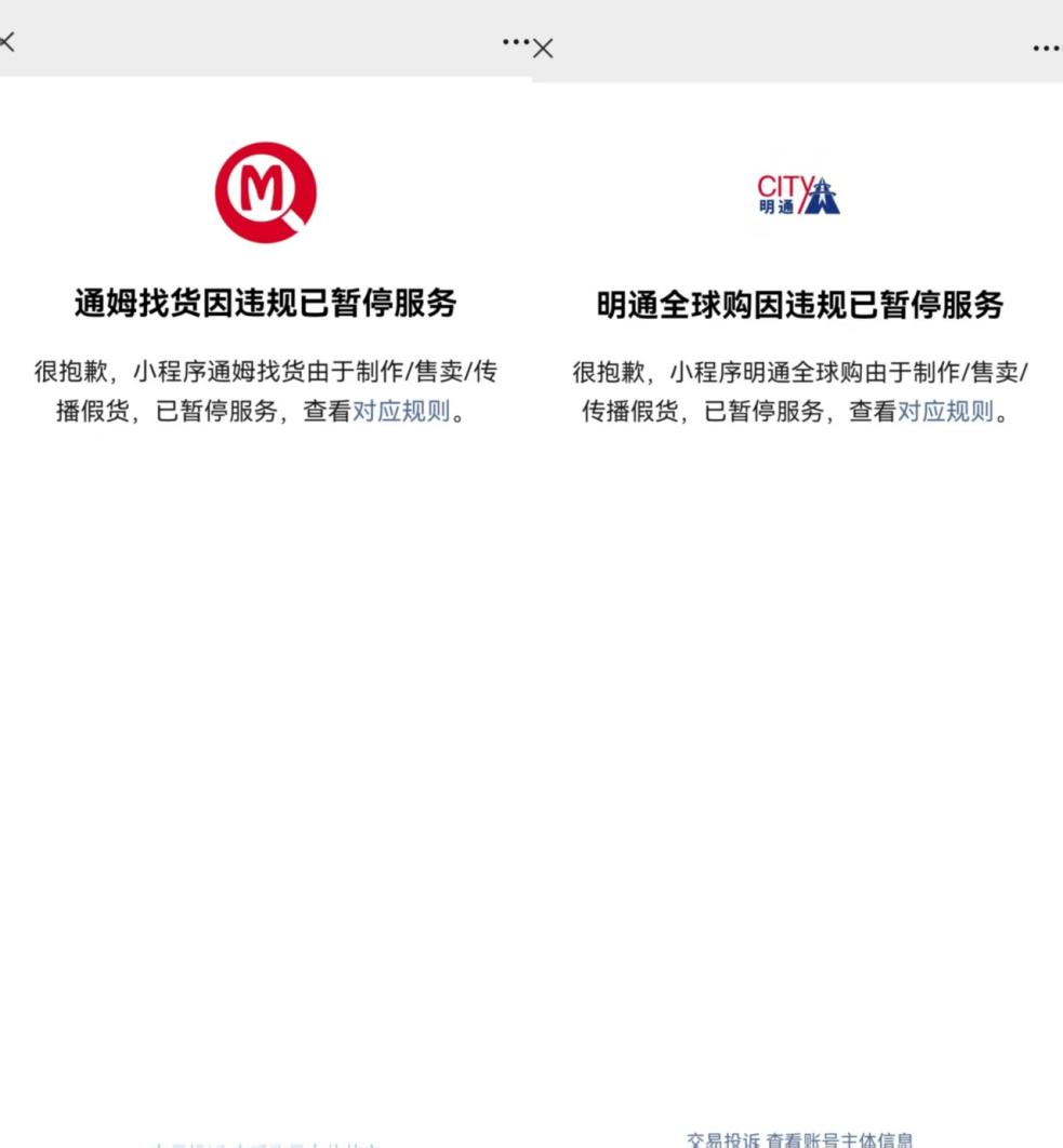 不难看出,深圳明通化妆品已形成从高仿生产到回收瓶罐装再到免税仓发货的全链路造假。但青眼注意到,截至发稿前,深圳明通市场的小程序“明通全球购”和“通姆找货”目前均显示“由于制作/售卖/传播假货,已暂停服务”。