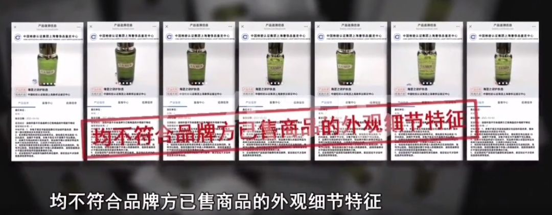 广东315晚会还披露,在小红书平台上,有不少有关“深圳免税化妆品”的帖子提及深圳华强北明通化妆品市场(以下简称深圳明通)。据此,媒体人员在深圳明通市场内不同店铺采购了两瓶海蓝之谜精粹水。但经中国中检奢侈品鉴定中心检测,送检的7个样品全部不符合正品特征。