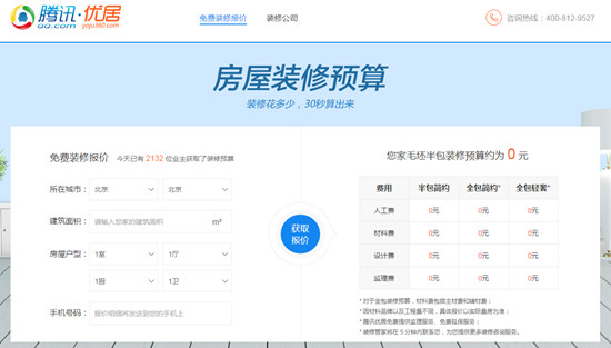 腾讯优居的网站相对简洁,只有免费装修报价和装修公司两大板块;此外,腾讯优居在腾讯家居设有入口,后者平台上有资讯、导购评测、设计潮流等内容。