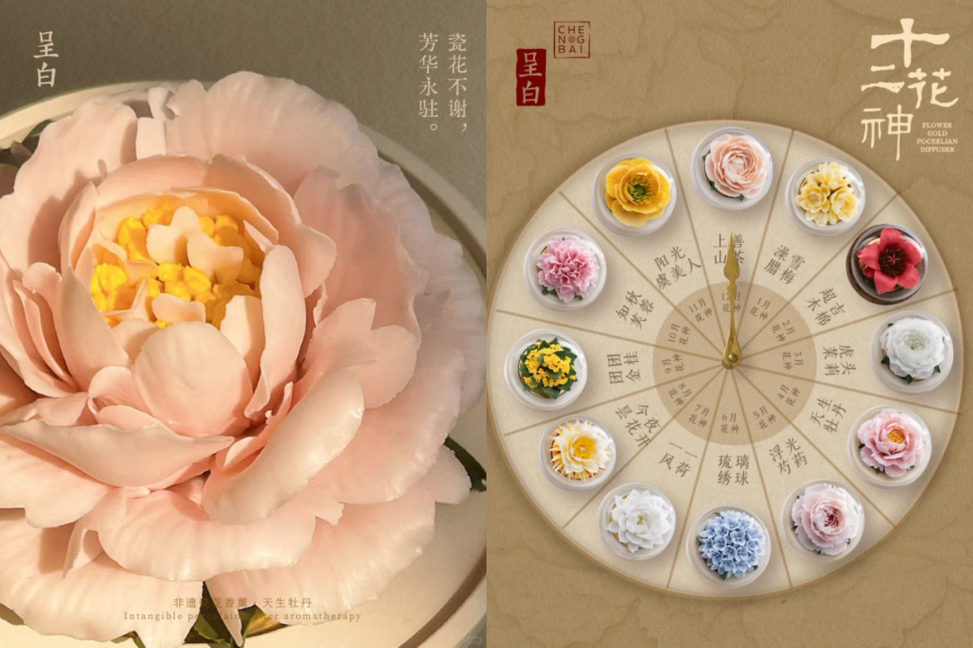 除了让非遗文化成为品牌的核心优势,还有不少品牌靠着深耕一种非遗文化在市场走红。比如,在小红书爆卖的东方非遗香氛品牌呈白,凭借着一款款兼具非遗文化和实用性的瓷花,让消费者为其买单。
