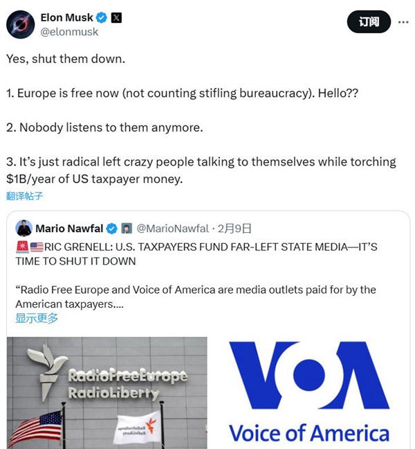 特朗普在第一个总统任期就对“美国之音”表示过不满,指责该媒体对其有偏见。美国“政府效率部”实际牵头人埃隆·马斯克上月在社交媒体转发要求关闭“美国之音”等媒体的贴文,指出现在已经没有人听相关电台的节目。马斯克还抨击各媒体宣传美国左翼意识形态,每年浪费美国纳税人10亿美元。