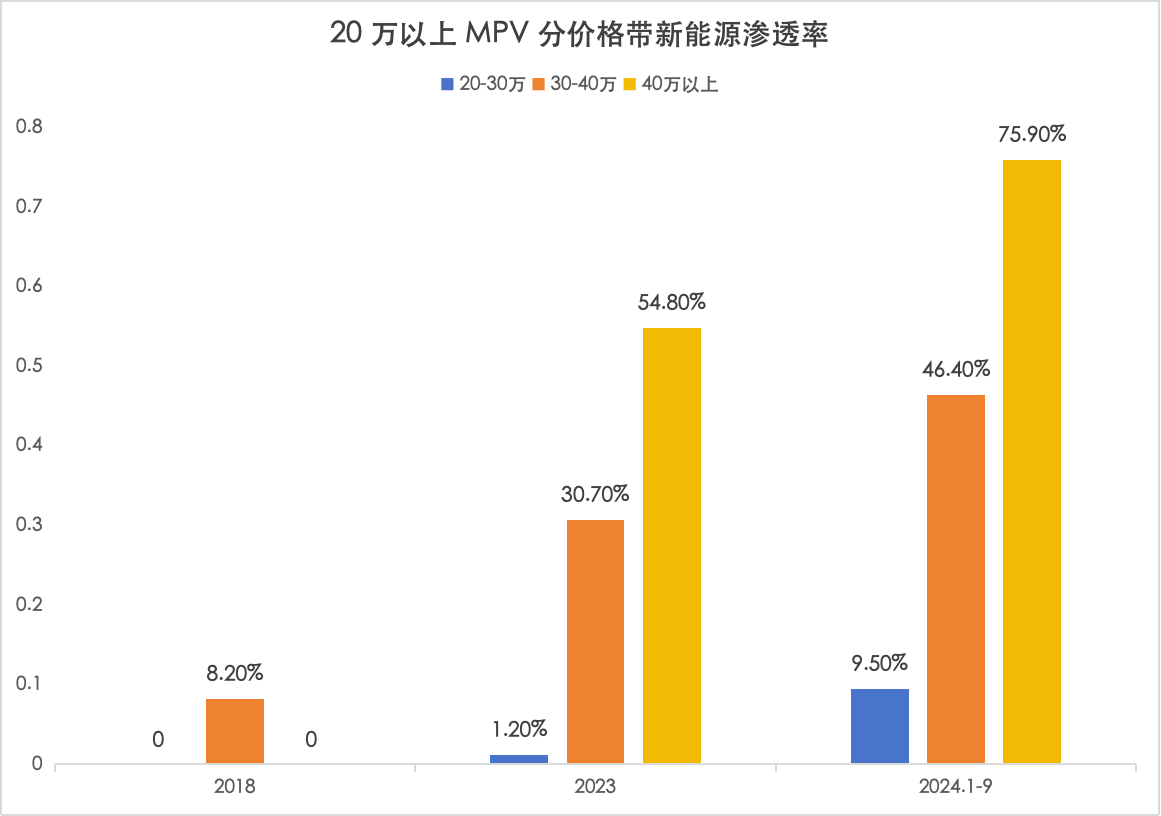 过去两年,MPV市场按价格带看,20-30万区间的新能源渗透率最低,2023年仅为1.2%,2024年前三季度增长到9.5%。