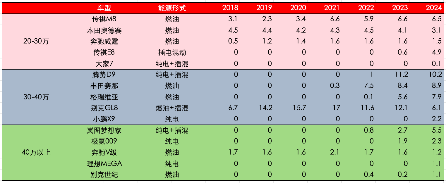直到行业转型的战火烧到这里,为了应对腾势D9的攻势,别克带来世纪、推出PHEV版GL8,传祺也推出了M8的混动版和插混的E8,其中后者2024年卖出4.9万辆。