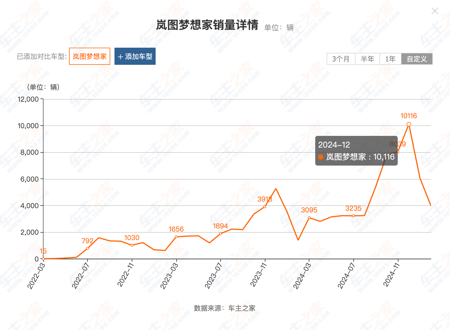 这款2022年3月推出的MPV,在2024年9月之前月销1000左右,搭上华为快车首次配备了乾崑智驾系统和鸿蒙座舱,在短短110天内收获了超过5万的订单,连续三个月稳坐新能源MPV市场的榜首。到了12月,其交付量更是突破万辆。