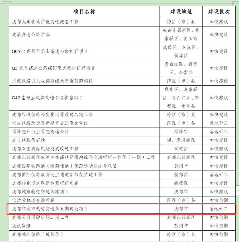 其中备受成都人关注的成都轨道交通第五期建设项目,也得到了官方正式的明确:落地开工。