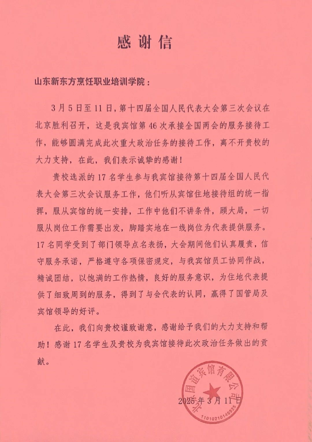 北京国谊宾馆特致感谢信,对新东方烹饪学子的辛勤付出和卓越表现表示诚挚感谢,同时对新东方烹饪教育的教学成果和学生职业素养给予了高度肯定。这不仅是对山东新东方烹饪学院学子个人能力的高度认可,更是新东方烹饪教育品牌在国家级舞台上的又一次辉煌展现。