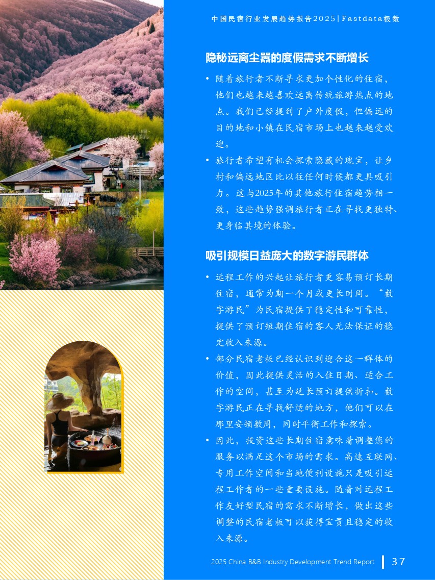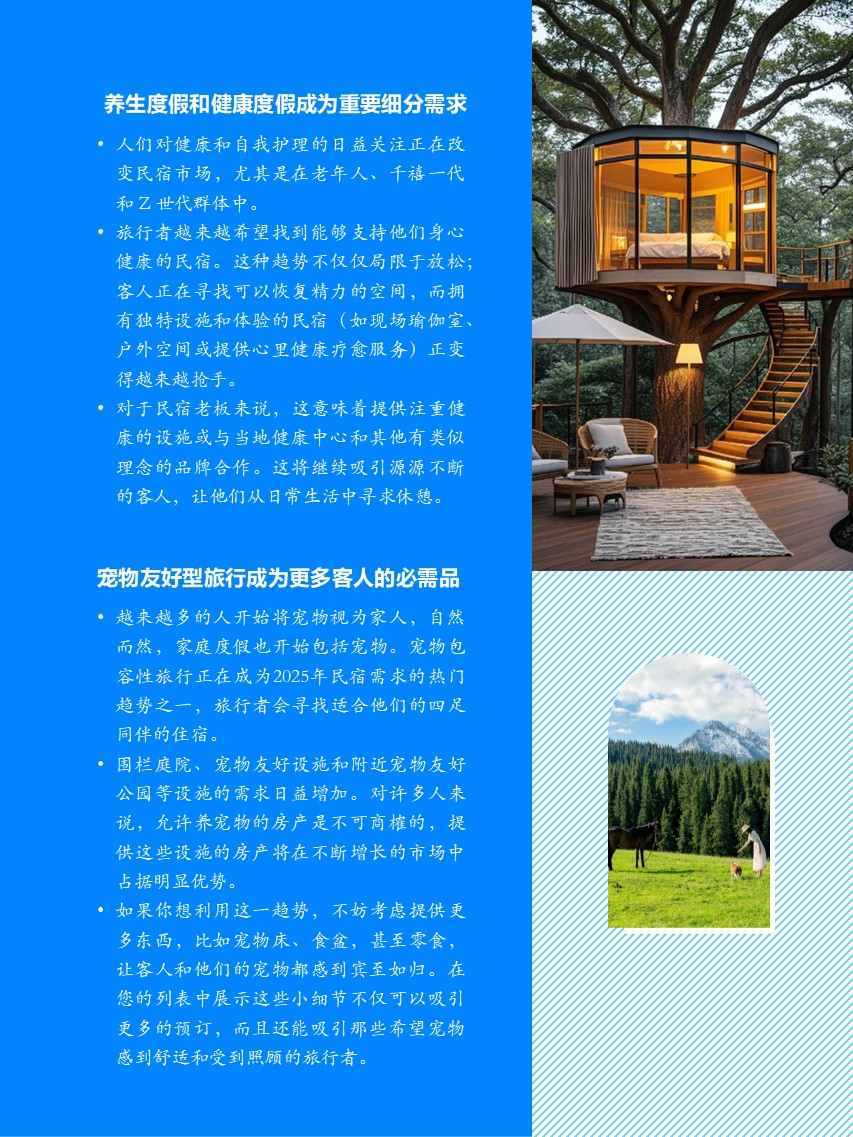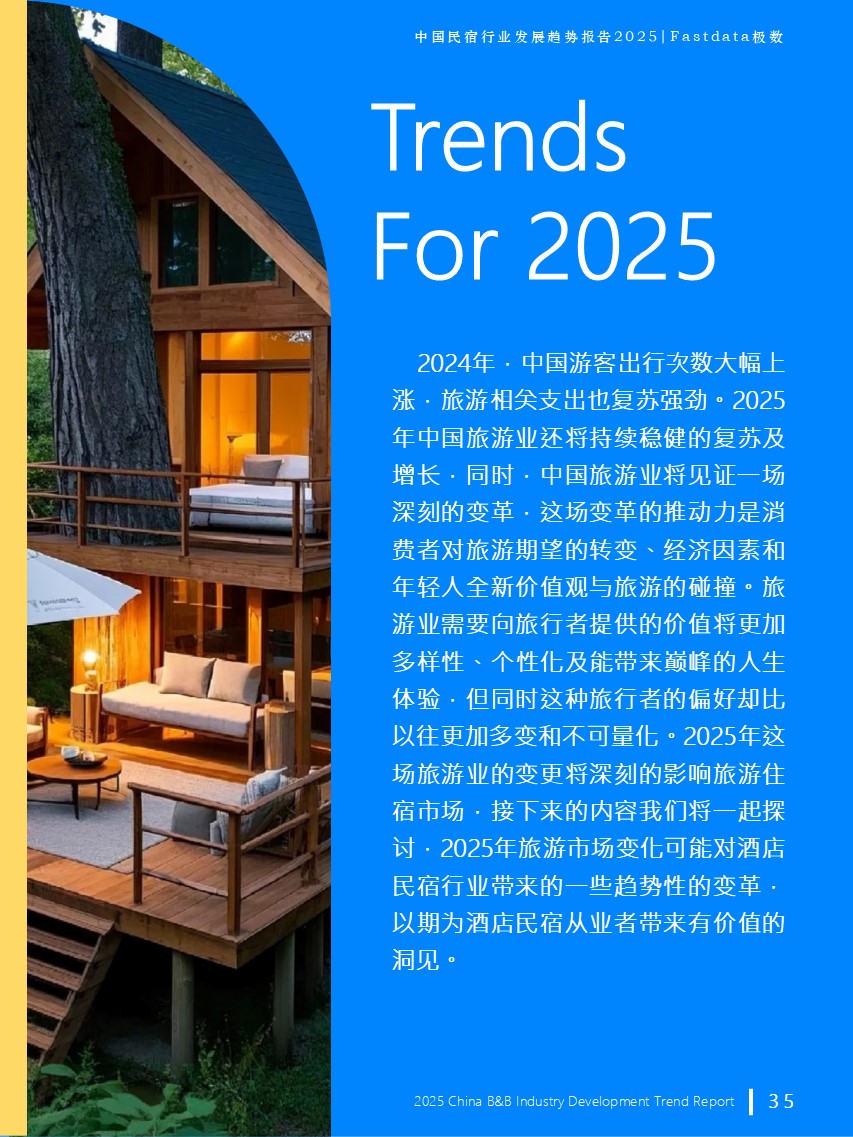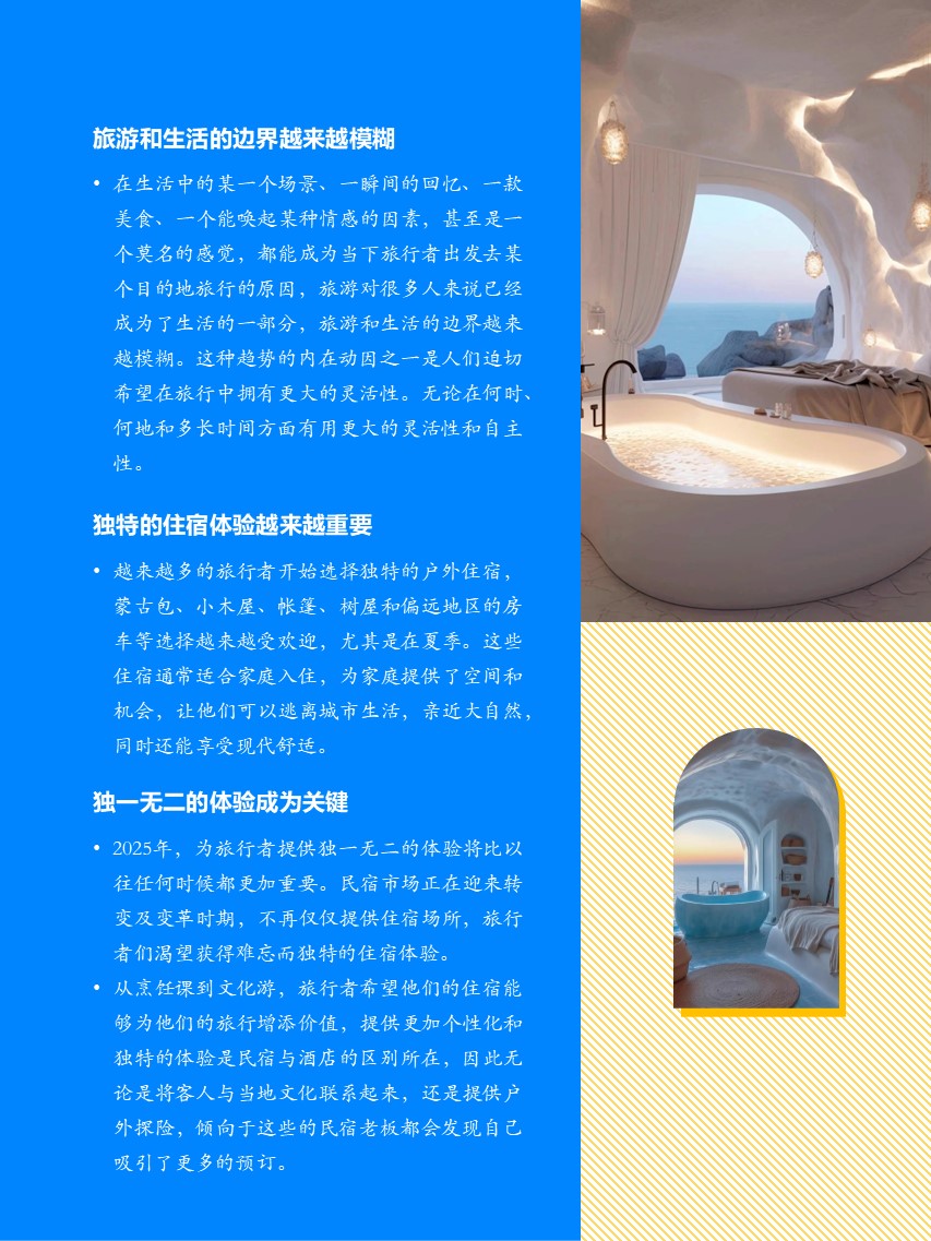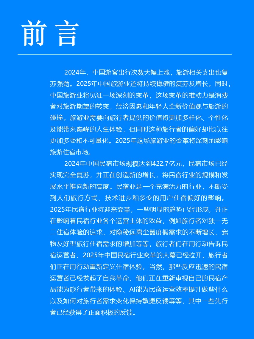 2025年民宿行业将迎来变革,一些明显的趋势已经形成,并正在影响着民宿行业各个运营主体的效益,例如旅行者对独一无二住宿体验的追求、对隐秘远离尘嚣度假需求的不断增长、宠物友好型旅行住宿需求的增加等等,旅行者们在用行动告诉民宿运营者,2025年中国民宿行业变革的大幕已经拉开,旅行者们正在用行动重新定义住宿体验。