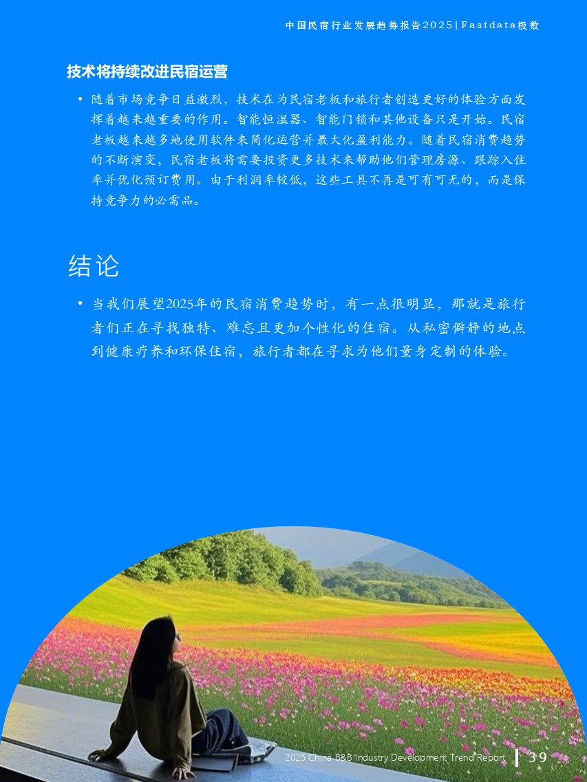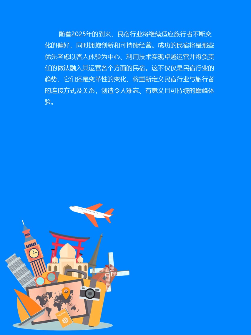 随着2025年的到来,民宿行业将继续适应旅行者不断变化的偏好,同时拥抱创新和可持续经营。成功的民宿将是那些优先考虑以客人体验为中心、利用技术实现卓越运营并将负责任的做法融入其运营各个方面的民宿。这不仅仅是民宿行业的趋势,它们还是变革性的变化,将重新定义民宿行业与旅行者的连接方式及关系,创造令人难忘、有意义且可持续的巅峰体验。