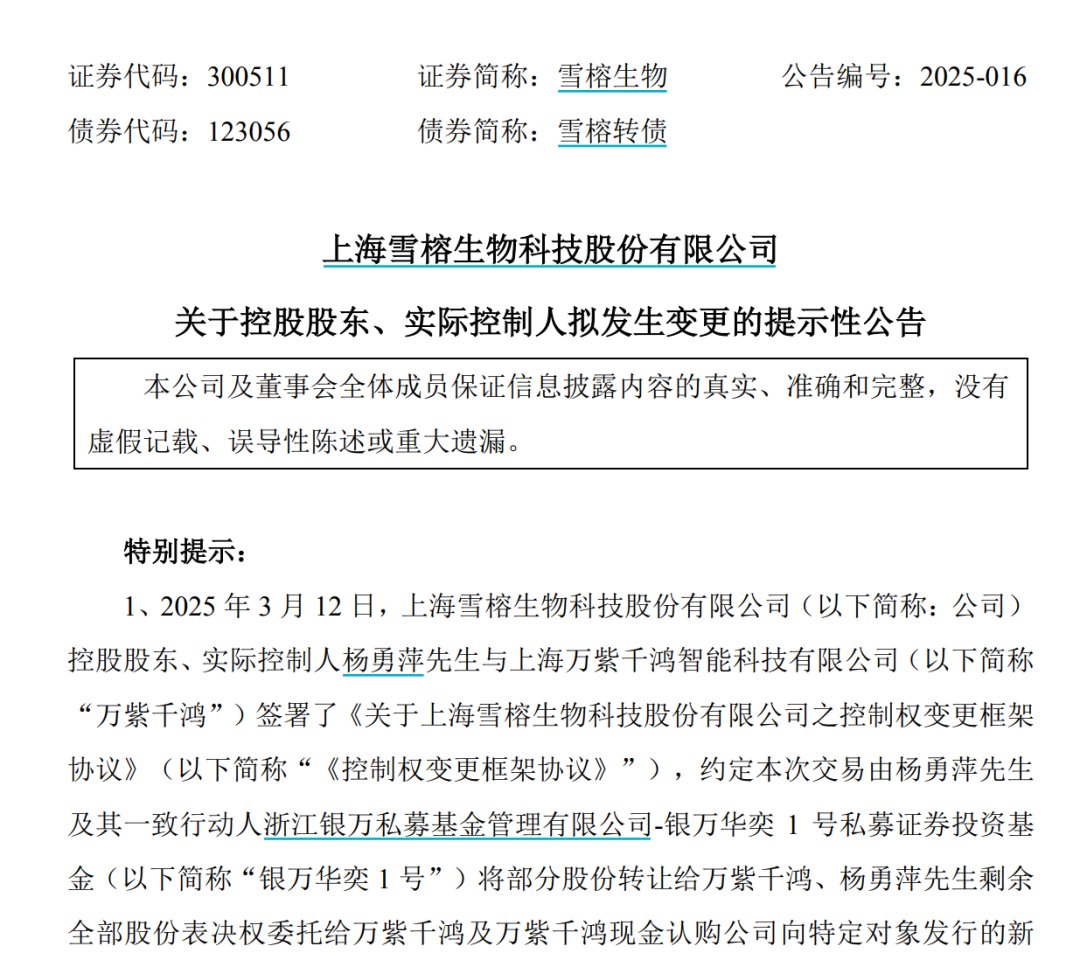 3月12日晚,雪榕生物公告称,当天,公司控股股东、实控人杨勇萍与上海万紫千鸿智能科技有限公司(下称:万紫千鸿)签署控制权变更协议框架。协议生效后,雪榕生物将正式“易主”——控股股东变更为万紫千鸿,实控人变更为蒋智。