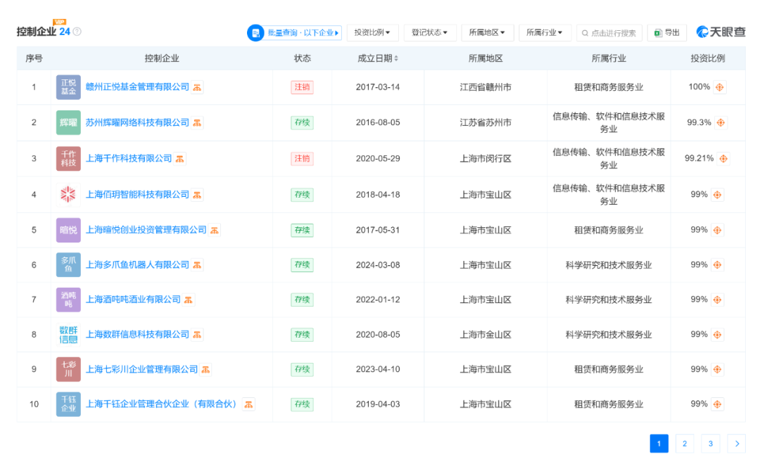 另据天眼查显示,蒋智实控24家公司,其中存续公司20家,这些公司涉及业务繁杂,不仅包括软件信息、智能机器人、新能源电池、通用设备制造,还涵盖酒类经营、食品销售、市场营销,以及投资管理、基金管理等等。