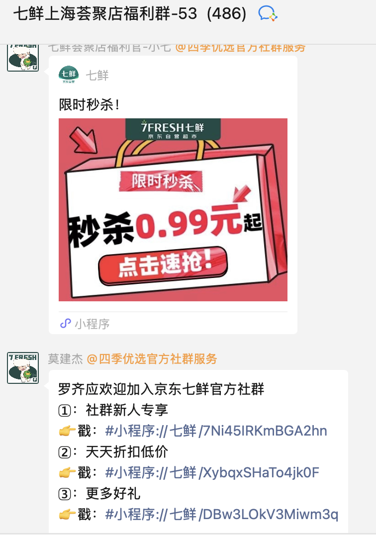 近期,七鲜在上海的扩张步伐也逐渐开始。为了拓展新用户,七鲜启用了小范围但高密度的地推。家住京东七鲜超市上海荟聚店附近的消费者,从春节后就明显感觉到各种促销和拉新活动变多了,比如新用户59减15、49减10以及0.9元整点秒杀等各种拉新活动。一地推人员告诉《窄播》,七鲜提供半小时到家服务,今年可能会在上海开仓。