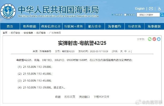 航行警告:南海部分海域进行实弹射击