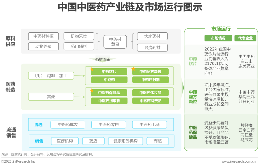 中医药产业链中,上游产业主要包括中药种植业、养殖业和畜牧业等;中游是中药材加工制造企业,将中药材原料加工成可供直接消费的中药饮片、中成药和保健品等;下游产业主要是医药流通与销售行业,将中药生产商的产品带向中医药消费市场,比如医院、药店、健康服务机构等。中医药整体产业链路清晰完备,运行模式良好。
