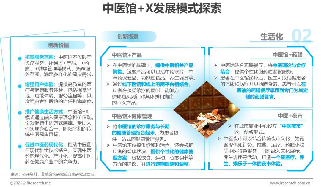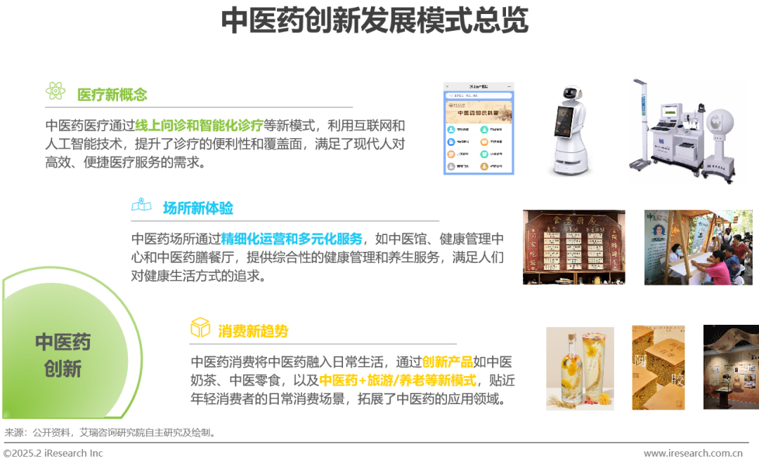 中医药在医疗、场所、消费三大领域的创新模式,推动了传统中医药的现代化与多元化发展。从线上中医诊疗、中医大模型落地应用,到中医馆里的养生餐厅、逐步兴起的中医夜市,再到融入中医药元素的中医奶茶、中医零食等消费品与保健品,中医药以创新的姿态走进日常生活,成为新时代消费者的新宠。
