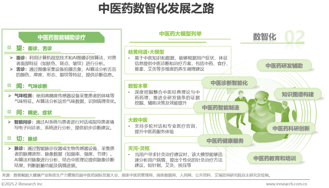 近年,我国中医药发展有目共睹,随着大数据、云计算和人工智能等新兴技术的不断涌现和飞速发展,ChatGPT等生成式人工智能应用热潮汹涌,中医药行业迈入数字驱动新时代,“数智化”已成为推动现代中药发展的新动力。中医药智能辅助诊疗将传统中医的“望、闻、问、切”四诊法进行数字化和智能化,提升诊疗的精准度和效率。与此同时,目前已有中医药企业在借助大模型进行中医药研发。随着技术的发展和应用的深入,这些大模型有望在中医药的多个领域发挥更大的作用,推动中医药的现代化和国际化发展。