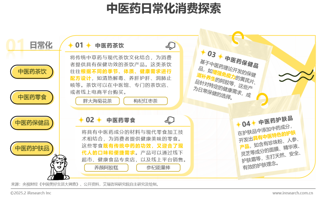 中医药,作为中国传统文化的重要组成部分,承载着及其丰富的历史和文化内涵。在新消费时代的潮流中,公众对自然疗法和中医养生的青睐日益升温,从“赛博问诊”的线上中医诊疗,到中医馆里的养生餐厅,再到融入中医药元素的中医奶茶、中医零食、祛湿贴等消费品与保健品,中医药以创新的姿态走进日常生活,成为新时代消费者的新宠。在新时代的大背景下,中医药正从传承好、发展好向创新好奋力迈进。