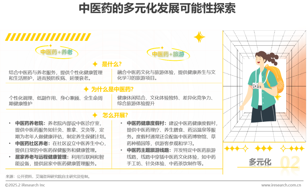 迈入2024新年,哈尔滨大量涌入的“南方小土豆”、各地文旅局长带头“文旅卷“等成为经济复苏增长的当下热潮。随着人们对健康养生的需求日益提升,以中医药观光、中医药文化体验、中医药疗养康复、中医药科普教育等为主题的中医药+旅游产品随之出现。除此之外,中医药文化源远流长,“中医+养老”的服务在近几年频频出圈,中医以其预防调养、康复护理等优势,进一步延伸医养服务范围,实现医中有养、养中有医,打造中国特色的医养结合模式。