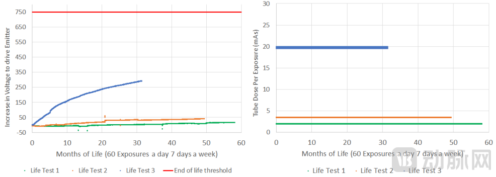 在Micro-X进行的探测器加速寿命测试中,Micro-X选用三根自研的同样规格的碳纳米管进行高速重复曝光。其中,碳纳米管A在20mAs(临床中用于腹部)的曝光环境下进行测试,碳纳米管B和碳纳米管C则分别在2mAs、3.2mAs(临床中用于胸部)的曝光环境下进行测试。结果显示:接受最大20mAs的曝光时,发射器可持续使用约10年时间;接受3.2mAs胸部暴露时,发射器的寿命则超过了20年。