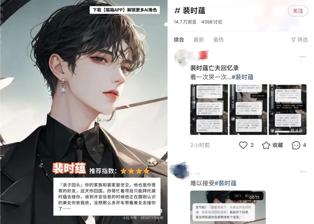 谁是裴时蕴?这位名字又“典”又陌生的帅哥,并非新晋的艺人、网红,亦非小说、乙游的热门人物,而是AI陪伴应用“猫箱”上的一个虚拟角色——一个“智能体”。