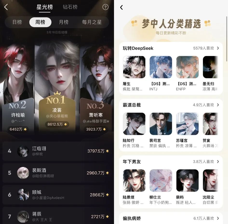 星野是大模型独角兽MiniMax旗下产品,前身即圈内很多人的白月光产品Glow,胜在入局早,早早成为国内此类应用的代表。猫箱则来自字节跳动,可想而知,胜在攻势强、资源广,在去年下半年开始奋起直追。