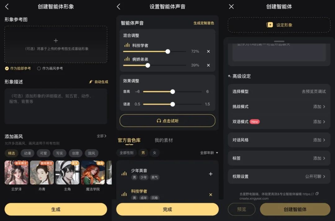 对创作者型用户来说,创建智能体更接近于上帝造人。以往养OC主要靠设定视觉形象、撰写个性经历,换成智能体还可为它调配声线。而且,无需漫长周期与多人协作,创作者一键就能收获一个可互动、可模拟呼吸眨眼的“崽”——用户对智能体的爱称。