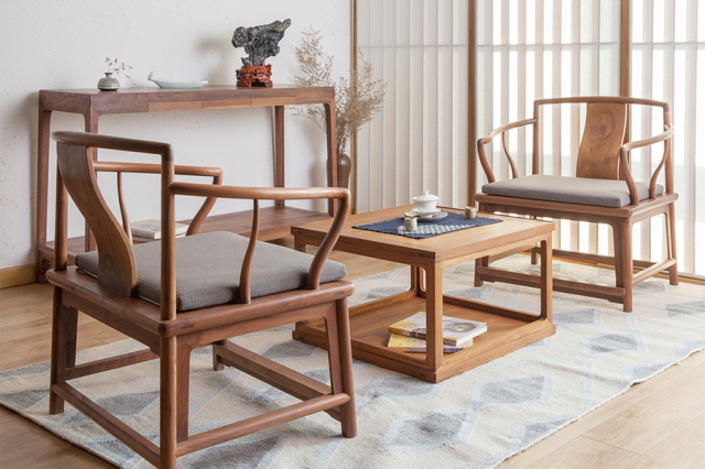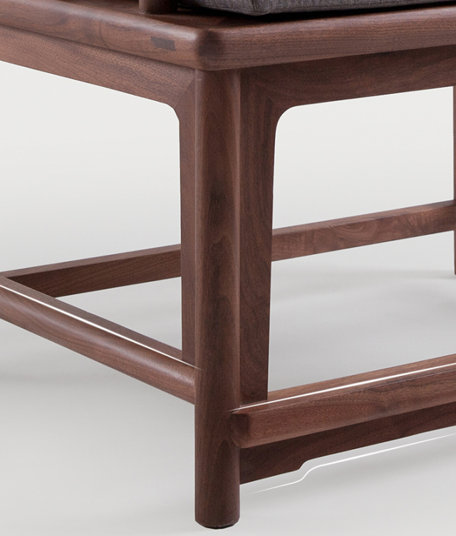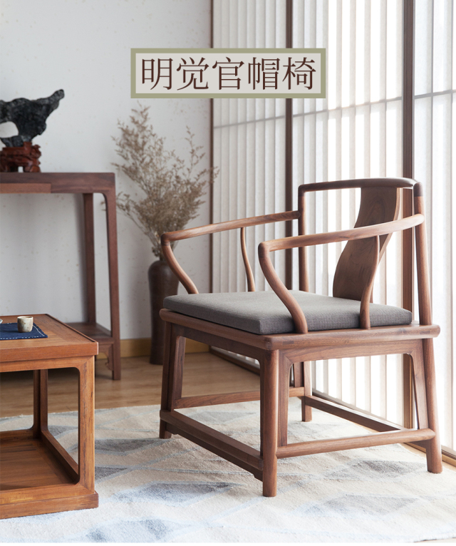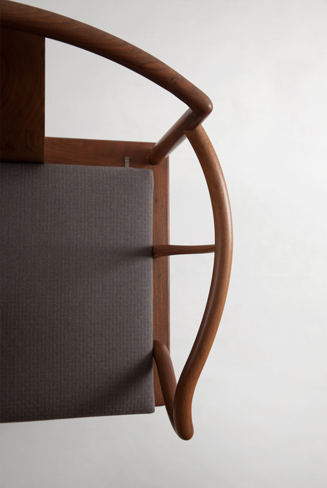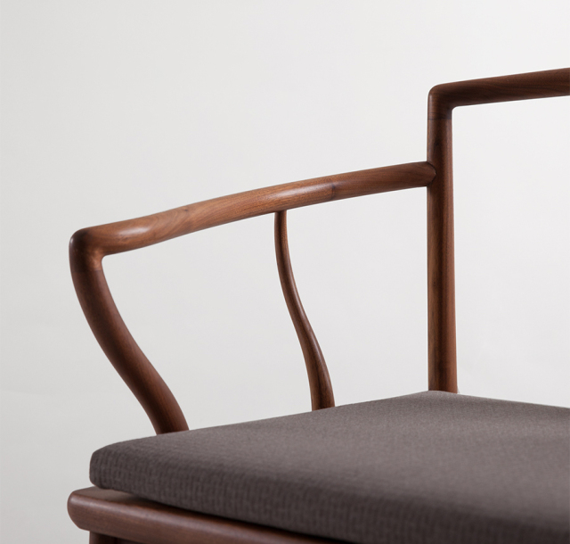 座椅取明代南方流行的官帽式样,但将其线条改为更温和婉约的圆弧型。靠背与扶手同曲,连绵成圆,直至扶手端头鹅脖处才有迂回。