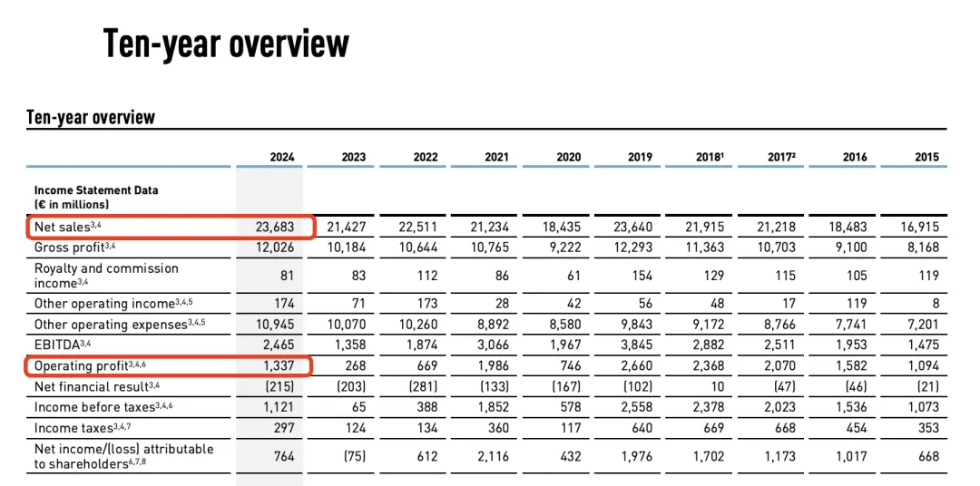 值得注意的是,这是阿迪首次恢复到2019年以来的营收水平。2020年以来阿迪的营收不断下滑,2020年一度下降到198亿欧元,此后有所回升。但是到了2023年再次负增长,较2022年的225亿欧元下降到214亿欧元。